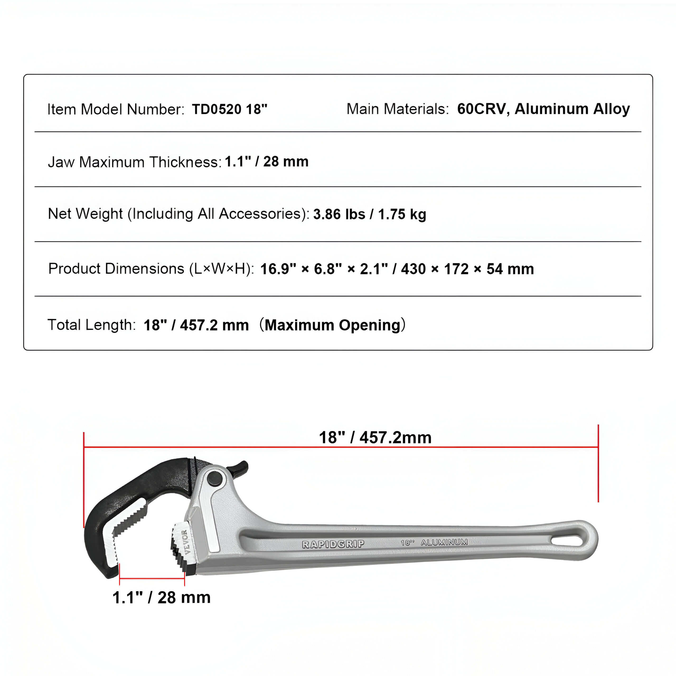 From home repairs to professional projects, this 18-inch aluminum pipe wrench is built to handle it all. Say goodbye to heavy, outdated tools and upgrade to a wrench that delivers unmatched performance, durability, and convenience. Get yours today and experience the difference!