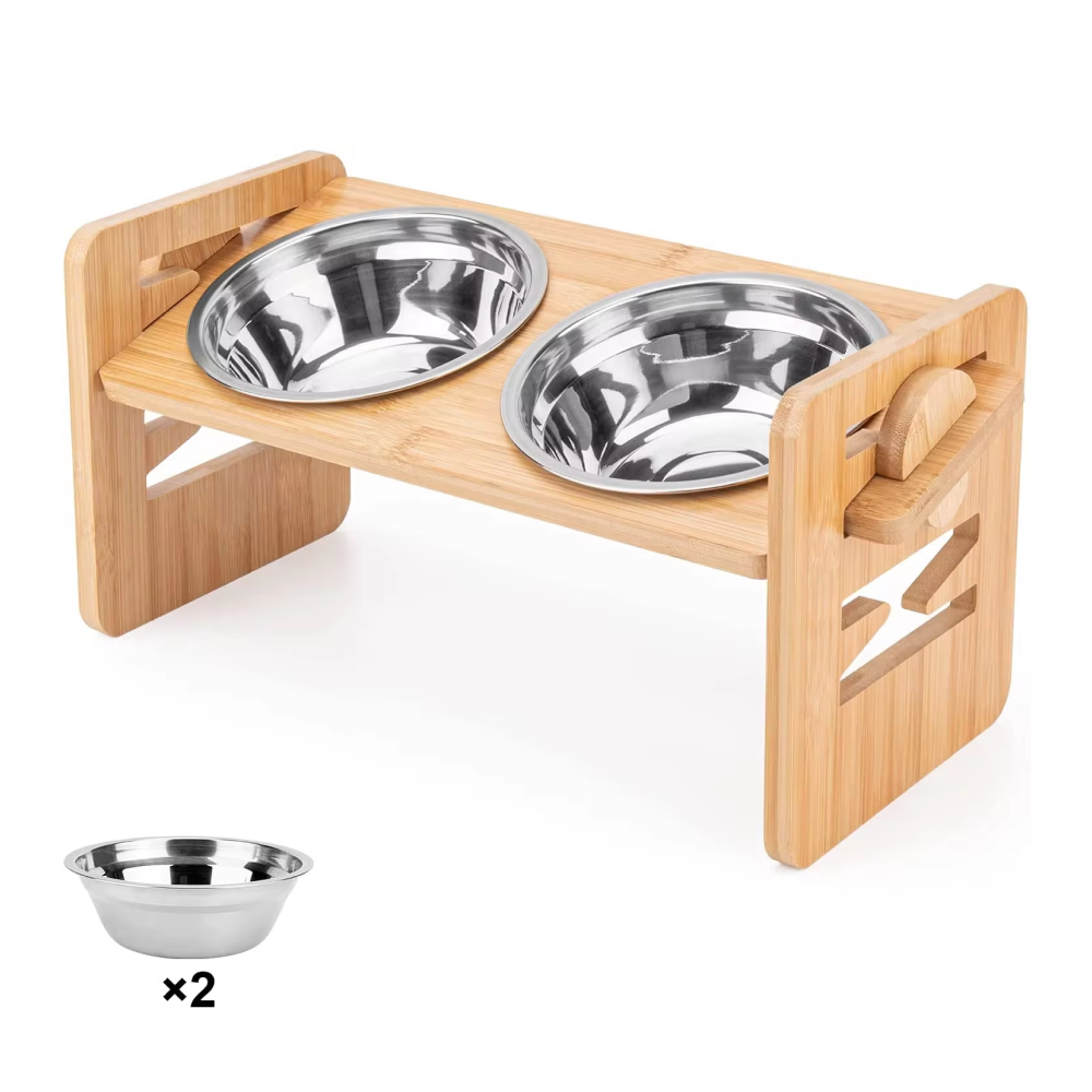 I really appreciate this product and its thoughtful design. The adjustable stand is a godsend, especially for my rapidly growing German shepherd puppy! It's so easy to change the height as he gets taller, ensuring that he always eats at a comfortable level. Moreover, the bamboo material of the stand is not just sturdy but also adds an aesthetic appeal to our kitchen space. I love how it doesn't look like your typical dog bowl set but more of a stylish piece in our home. Plus, cleaning has been made so much easier with these bowls - they're simply perfect!