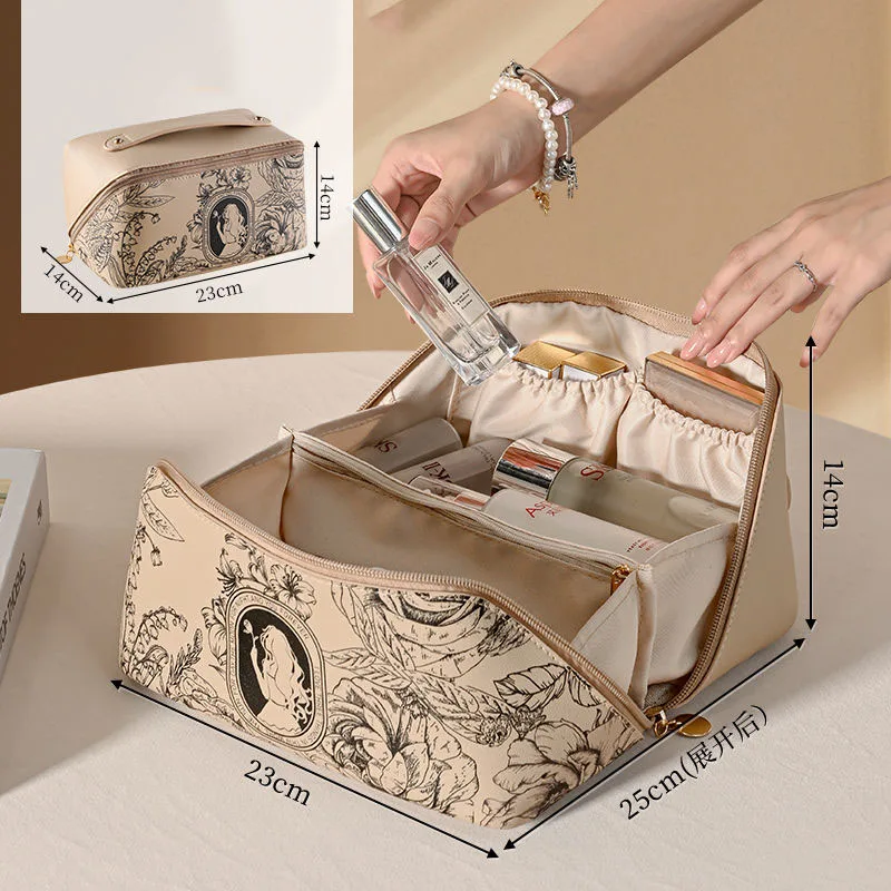 - Large-Capacity Design: Generously sized to accommodate all your makeup and toiletries. The high-quality cream leather fabric is both soft and durable, with a waterproof and washable finish that keeps your belongings protected from spills and splashes.