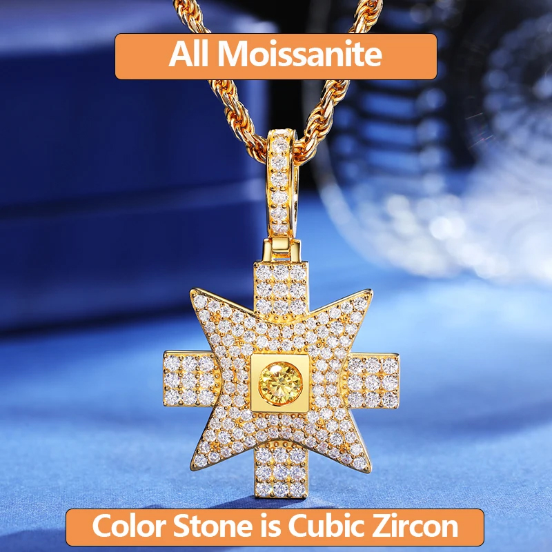 The pendant features an intricately designed Maltese Cross, encrusted with shimmering Moissanite stones, which rival diamonds in brilliance and fire. The stones are complemented by the icy brilliance of the silver, making it the ideal piece for anyone who loves to make a bold fashion statement. Available in both gold and silver finishes, this pendant is versatile enough to suit any style preference.