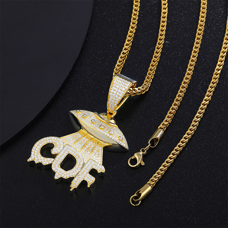 - Bold UFO Design: The intricate, iced-out design of the UFO spaceship pendant adds a futuristic touch to any outfit. The geometric shape, enhanced with shimmering stones, gives the pendant an urban, hip hop-inspired vibe.