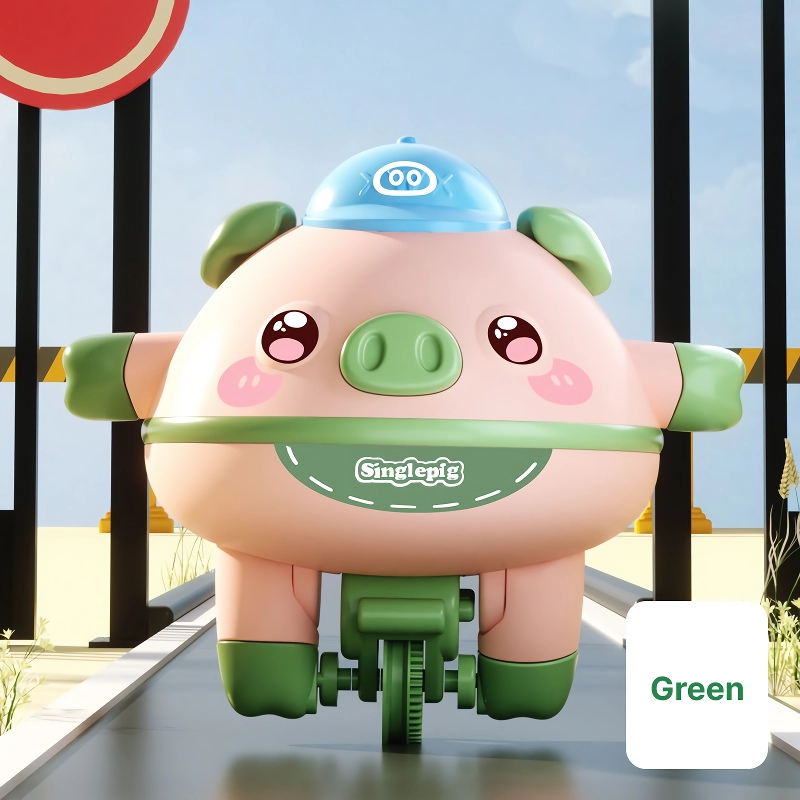 - Design: Cute pig character on a unicycle, balancing on a tightrope