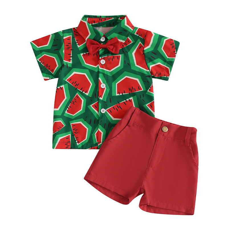 Brighten up your toddler’s summer wardrobe with this irresistibly cute two-piece outfit featuring a vibrant watermelon print. This short-sleeve button-down shirt and matching shorts set is designed to keep your baby boy cool, comfy, and looking adorable on those warm sunny days. With its fresh colors and playful design, this outfit is perfect for everything from playdates to picnics, beach days, or casual outings with family.