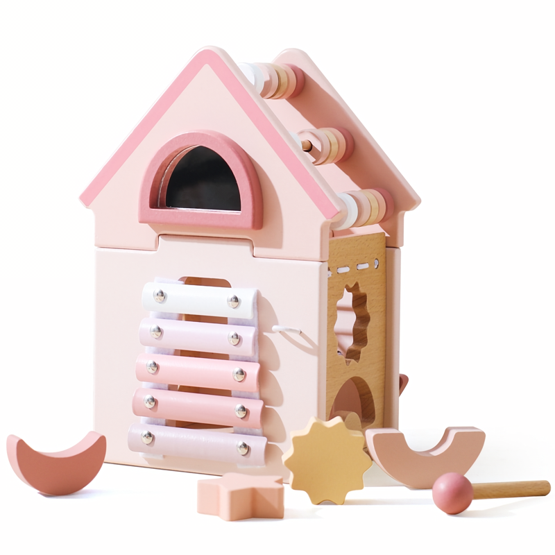 Our Wooden Five-in-One Montessori Activity House is perfect for both interactive play and learning. Whether your child is playing independently or with friends, this toy provides a stimulating environment that promotes cooperative play and social interaction. The various activities on the house offer endless opportunities for creative exploration and problem-solving.